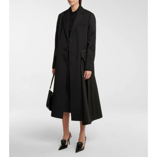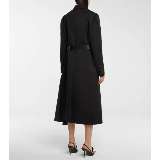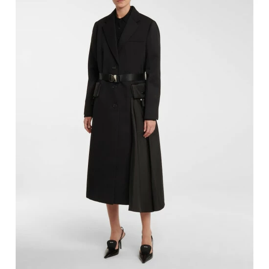 This black coat from Prada symbolizes the label’s future-facing aesthetic. A single-breasted design it has a belted waist, zipped pockets in contrasting nylon the echo the label’s accessories line and a pleated panel below the waist for an element of movement.