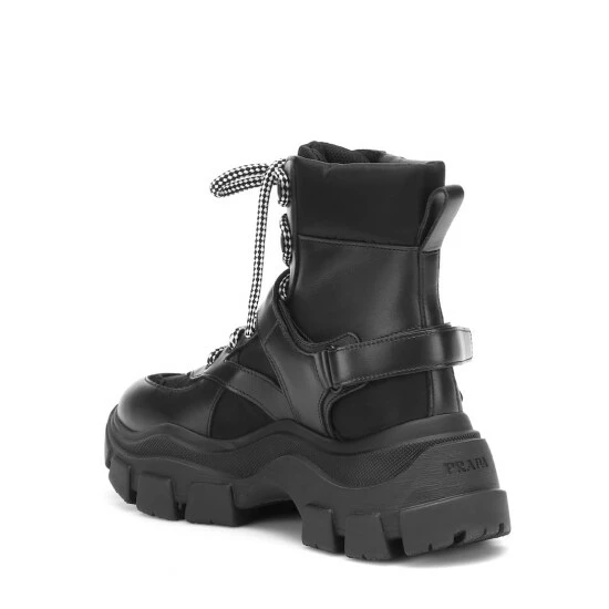 The Block ankle boots are a technical take on the chunky silhouettes seen stomping down Prada’s Fall 19 runway. Set on exaggerated rubber soles with tooth-like treads, they’re crafted in Italy from a mix of black leather and mesh, with checked laces that nod to hiking styles. Buckled straps at either side lend a utilitarian slant.