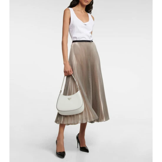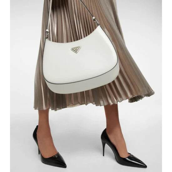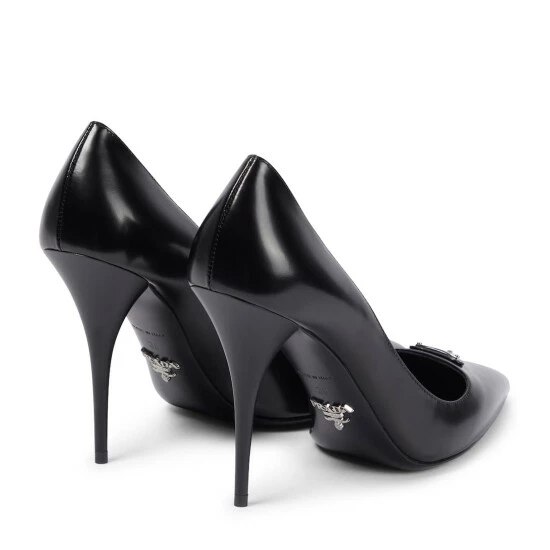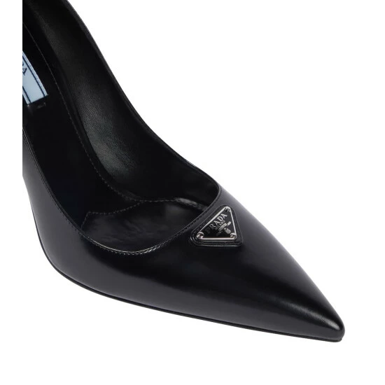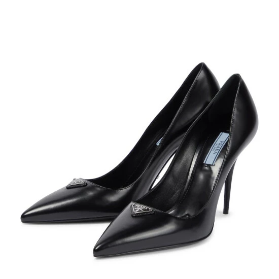 Made in Italy from brushed leather, these pumps have pointed toes and stiletto heels. This piece features Prada’s iconic triangular logo plaque, which embodies simplicity, elegance, and quality.