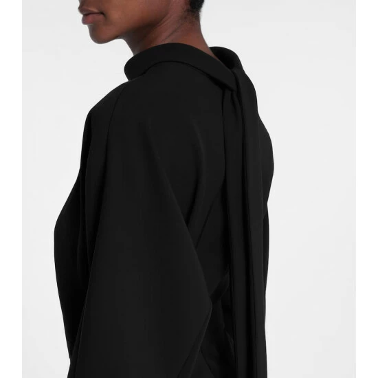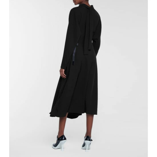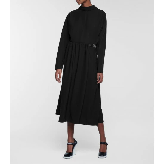 This black midi dress from Prada is a minimal style with modern sensibilities and label-signature accents. Its silk-twill fabrication ensures a beautiful drape. Note the gathered panel that wraps across the front – it fastens with a push-buckled strap, instantly denoting this piece as a Miuccia Prada design.
