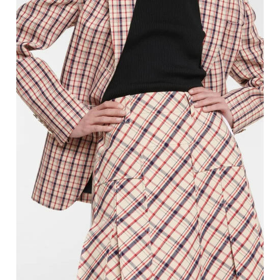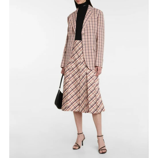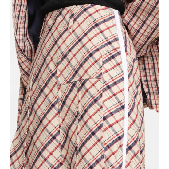 Prada brings its characteristically left-of-center perspective to heritage prints, adding sporty side stripes to this checked midi skirt. Made in Italy from virgin wool, the style posses a high-rise, yoked waist and falls into a pleated silhouette.