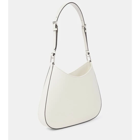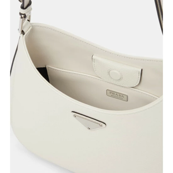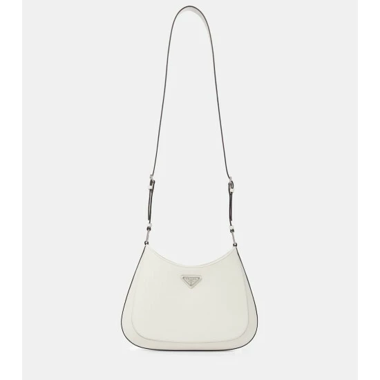 Meet the newest member of the Prada bag family: the Cleo shoulder bag. A modern interpretation of a style from the archives, this white brushed Saffiano leather design is lined with signature nylon and finished with the house’s iconic enameled triangular emblem. Expect to see it on the arms of fashion’s finest this season.