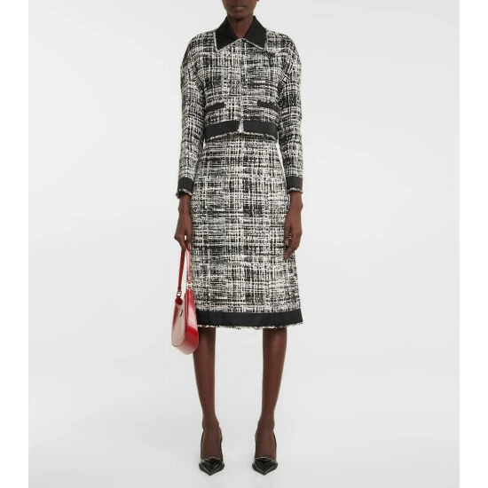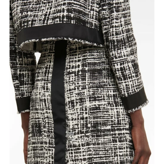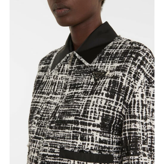 For a sophisticated look, turn to this crop jacket from Prada. Made from cotton and linen bouclé, it’s edged with solid-black trims and topped with the label’s triangular logo plaque.