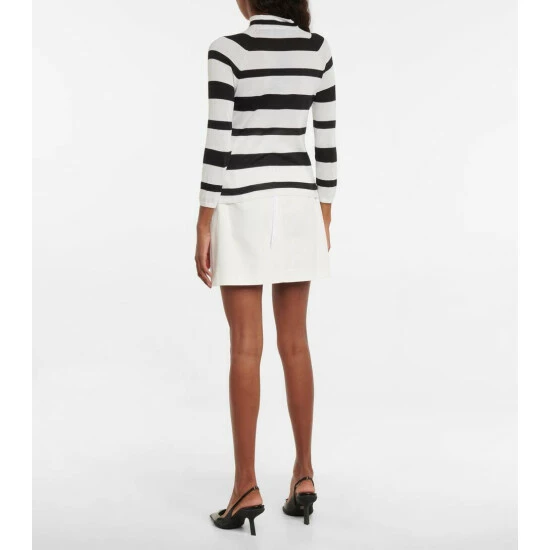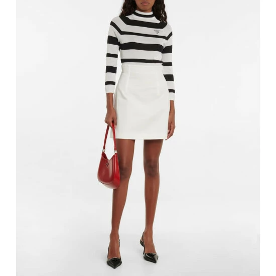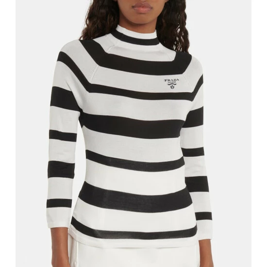Ever since Neil Barrett’s first collections, Prada has become a visionary for athleisure. This sporty, yet stylish sweater is knit from a semi-sheer, striped cotton and silk-blend with a mockneck, ribbed trims and logo detailing.