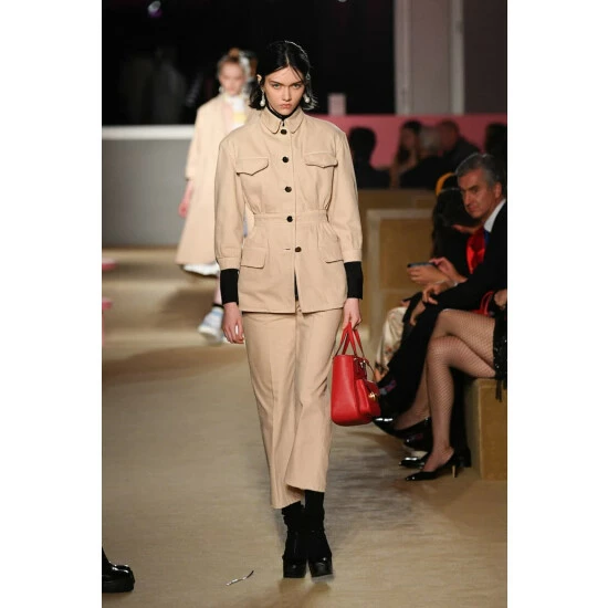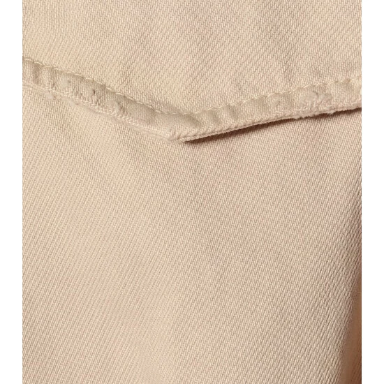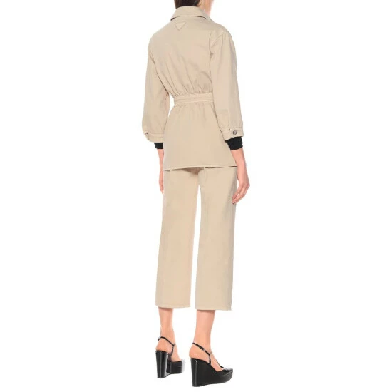 For its latest collection, Prada offers a modern take on safari chic with this beige cotton-denim jacket. Made in Italy, the style has a high, pointed collar; a button front with silver-tone fastenings; three-quarter sleeves; and a nipped-in waist that accentuates the silhouette.