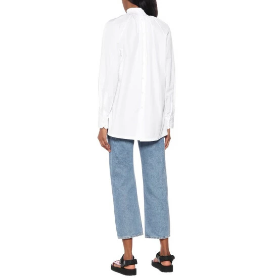 Prada offers a modern twist on a style staple with this white blouse. Crafted in Italy from lightweight cotton poplin, this piece is defined by a smocked neckline and high-low hem. Wear yours into the weekend with cropped jeans and sporty sandals for a directional edit.