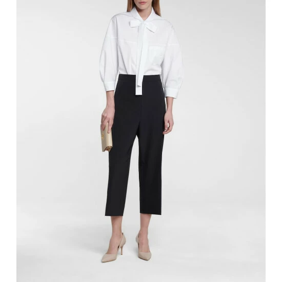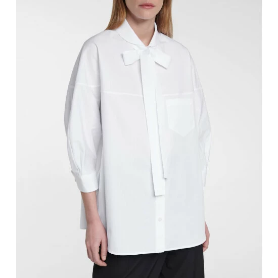 Prada experiments with proportions to create this anything-but-basic take on the classic white shirt. Made in Italy from cotton poplin, it has an oversized silhouette with a pointed, self-tie collar, dropped shoulders, and voluminous sleeves.