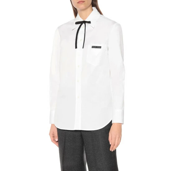 Simply shaped yet utterly polished, this white shirt from Prada is sure to charm. The design is crafted from cotton into a classic shirting design, complete with sharp collar and button-down front. Highlight the logo detail and black bow by styling with separates in dark tones.