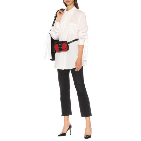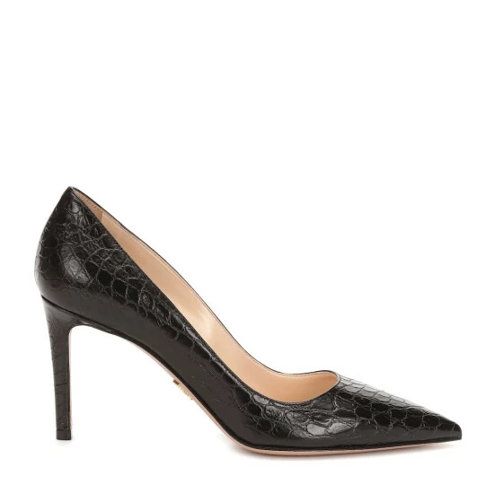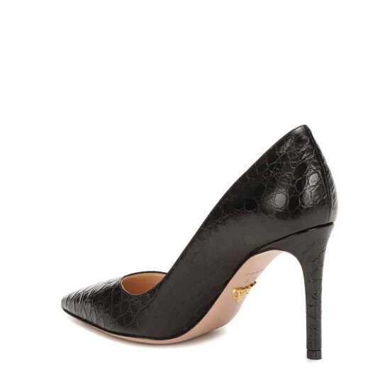 Textural motifs lend an exotic edge to these black pumps from Prada. Crafted in Italy from croc-effect leather with dusty pink Saffiano soles, they’re cut to a point-toe silhouette and set on sharp stiletto heels. Note the house’s Milano logo in a gold tone subtly placed under foot.