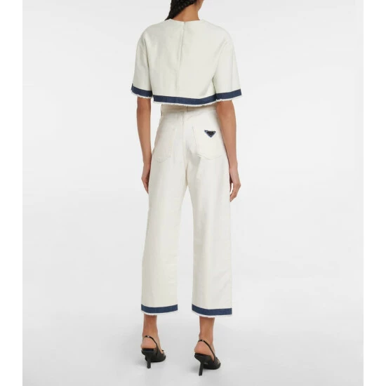 Prada revisits the casual T-shirt with this cropped denim design. It has frayed edges and a triangular logo plaque that’s affixed atop a matching denim appliqué.