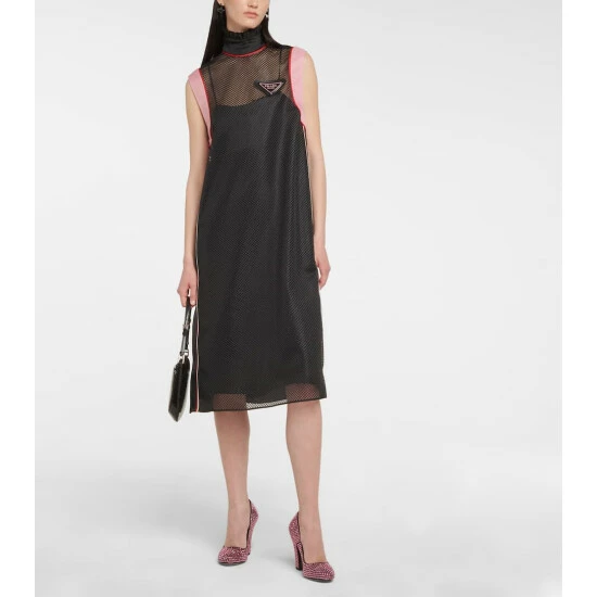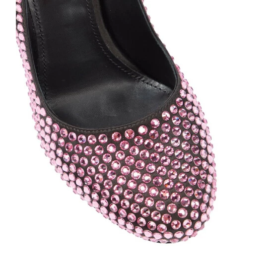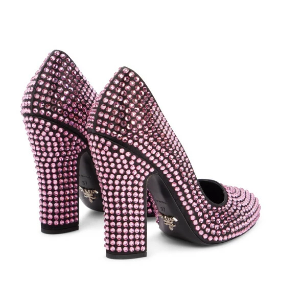 Debuted on the Milan runway, these pumps from Prada come coated entirely in light-catching pink crystals. Set on a high block heel, they have a round toe and logo plaque detail on the leather sole.