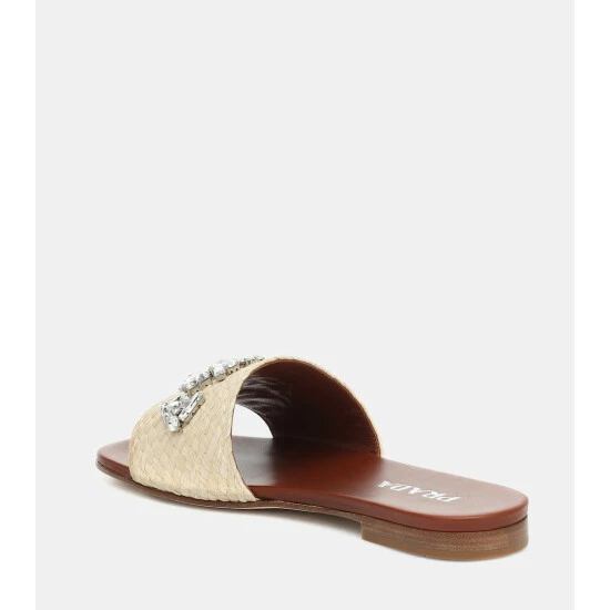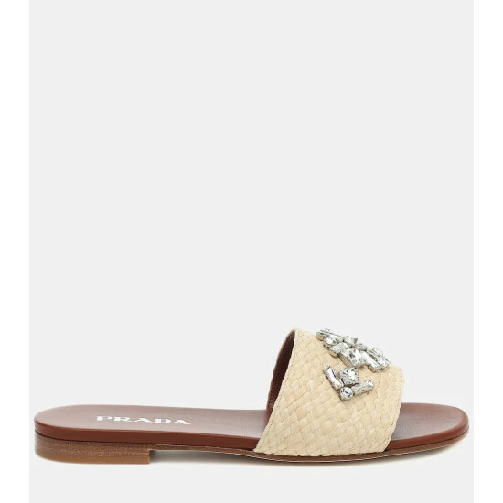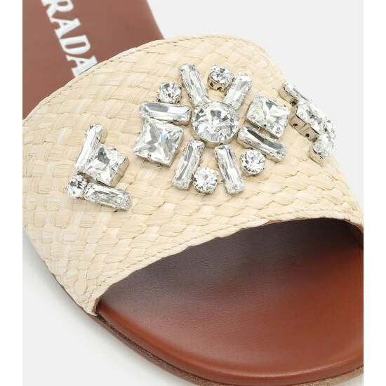 Prada gives the vacation-essential raffia sandal a glamorous uptick with crystal embellishments. This ivory-toned slide silhouette is made in Italy and sits atop a comfortable leather sole. Consider them a must-pack for your next destination vacation.