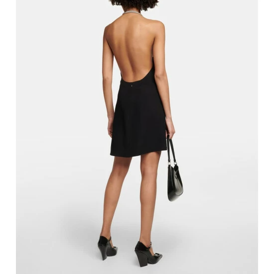 Perfect for evening occasions, this cady minidress from Prada is the epitome of effortless elegance. The A-line design features strands of glimmering metal beads at the neckline and is finished with an alluring open back.