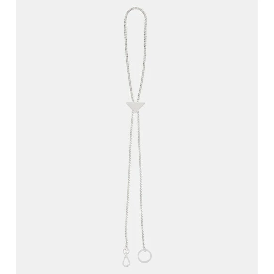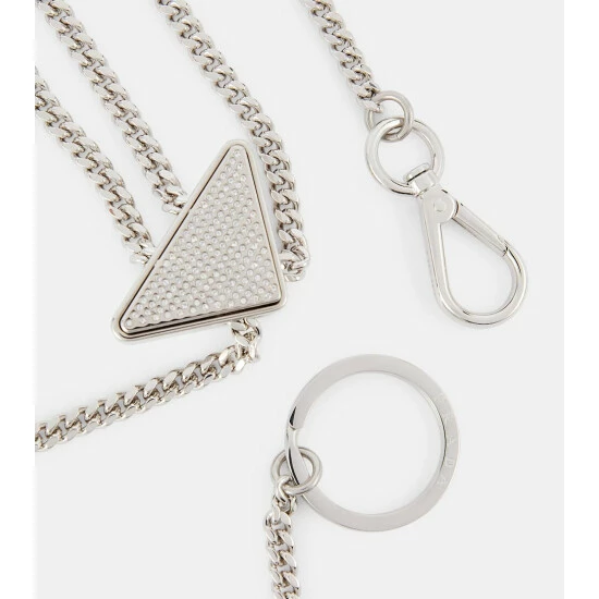 Treat yourself, or a fellow Prada lover, to this statement keychain. The iconic triangular plaque is encrusted with crystals, and accents long-length brass chain-links.