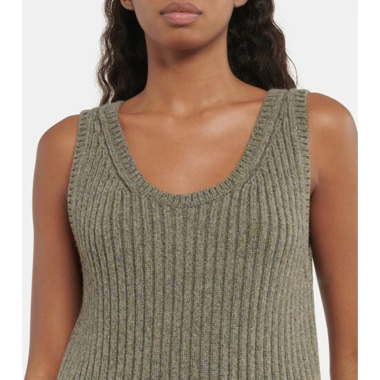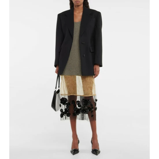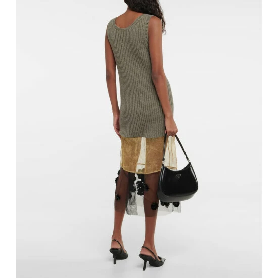 This midi dress from Prada is a scintillating mix of materials and textures. Made from wool and cashmere, the ribbed-knit style features a shimmery panel insert and sheer hem embellished with intricate floral embellishments.