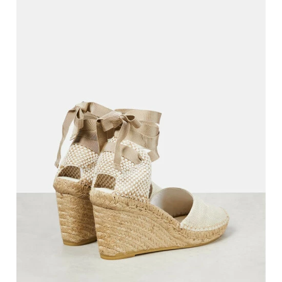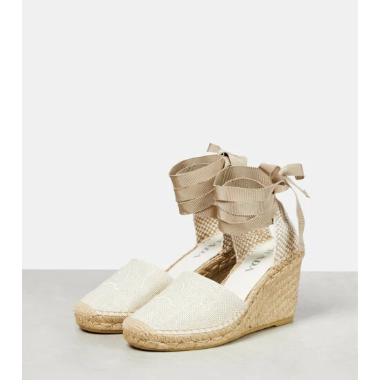 Prada brings their unparalleled sophistication to summer’s favorite shoe: the espadrille. This wedge style features a tie at the ankle and the brand’s logo at the toe.