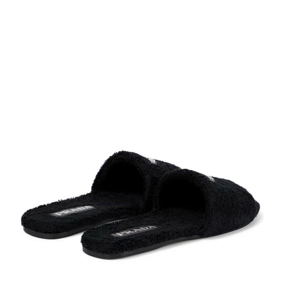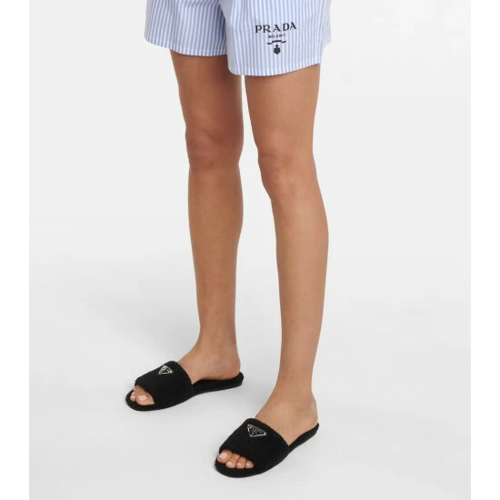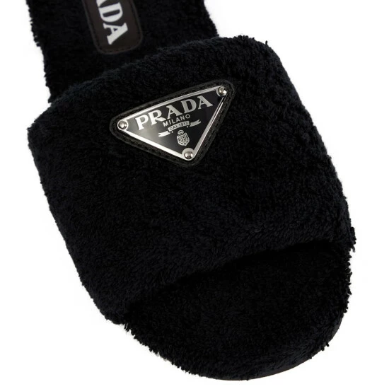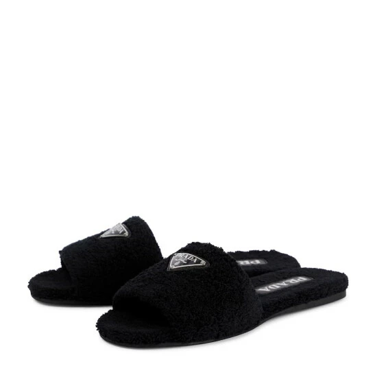 For a cozy casual aesthetic, opt for Prada’s slides. Made in Italy with faux shearling straps, they’re accented with the label’s triangular emblems.