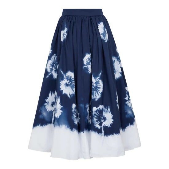 This midi skirt from Prada is embellished with a floral batik print for an artisanal touch. It’s made from crisp cotton poplin to a full circle shape that’s structured with pintucks and a waist belt.