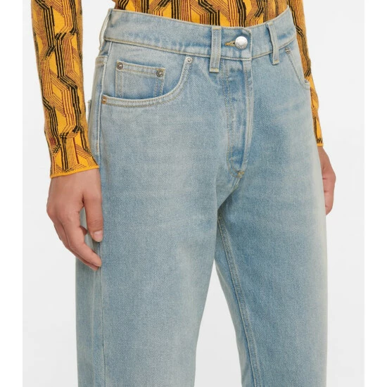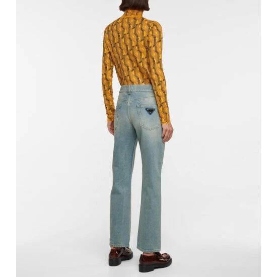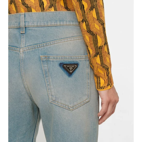 When the Prada woman goes off-duty, she slips into these faded blue jeans. Made from organic cotton denim with distressing, they have a straight leg and a slouchy, high-rise waist that can be worn lower on the hips.