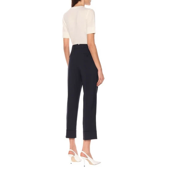 Elevate your essentials edit with these navy pants from Prada. Crafted in Italy from luxurious virgin wool, this pair sits high-rise on the waist, before falling to a slim leg with rolled cuffs. Wear yours with a striped shirt and red loafers for a classic-cool look.