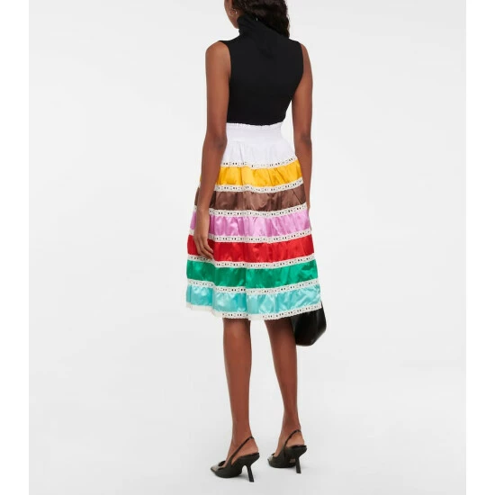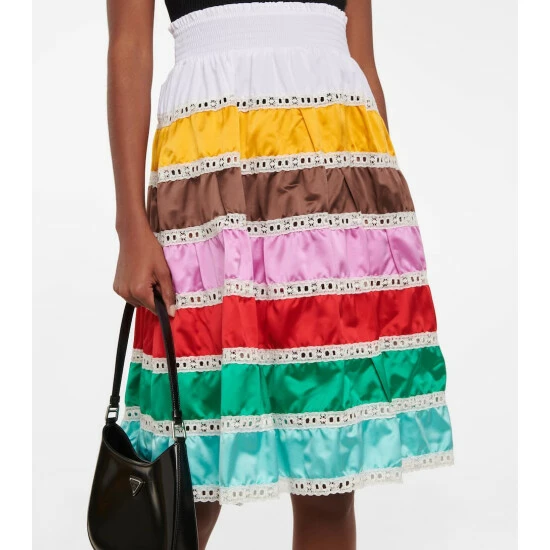 Prada makes kitsch cool with this paneled midi skirt. The Italian-crafted piece is cut from lustrous silk in rainbow hues and features lace details trimming the tiered design. Take your styling cues from the catwalk, matching this playful design with mannish silhouettes for modern contrast.