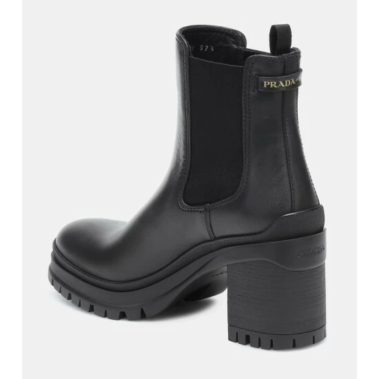 Put a tough-luxe spin on autumnal looks with these black ankle boots from Prada. Made in Italy from calf leather, they have elasticated side gussets for easy on-off wear, and are set on chunky block heels with rubber treads. Showcase yours with skinny jeans and breezy dresses alike.