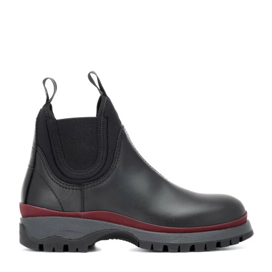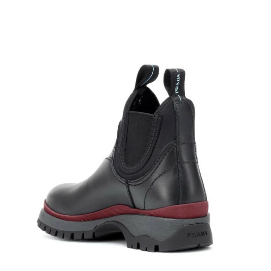 Prada plays with utilitarian inspiration for FW18, as demonstrated by these hardworking Chelsea boots. Crafted in Italy, they are shaped with futuristic neoprene panels that mirror the rounded shape of the toe. The chunky sole comprises layers of red, light and dark gray rubber that ensures a sturdy stride. Wear yours with a sheer dress for contrast.