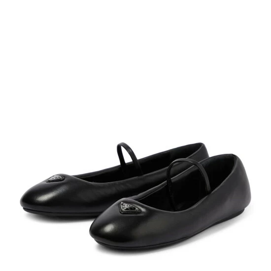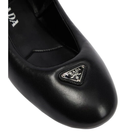 Add an elegant touch to your footwear edit with these ballet flats from Prada. Made in Italy from leather, this classic silhouette has rounded toes, dainty bows, and signature Trangolo plaques.