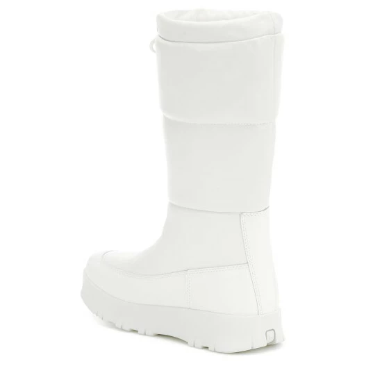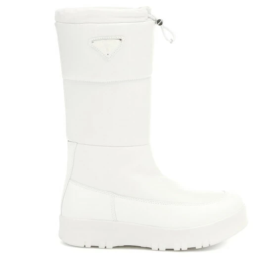 Prada makes solutions dressing a high-fashion affair with these white snow boots. Crafted from quilted leather, the design features a drawcord topline to lock in heat, as well as a rubber outsole for traction. The triangle logo plate on the outer sides testifies to their stylish impact.