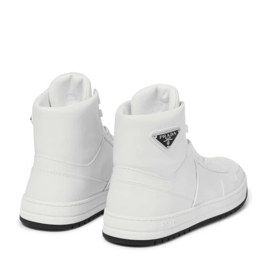 These high-top sneakers from Prada have a retro-sporty look. Reminiscent of vintage basketball silhouettes, they’re crafted from leather with logo detailing at the tongues and sides.
