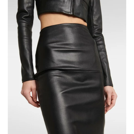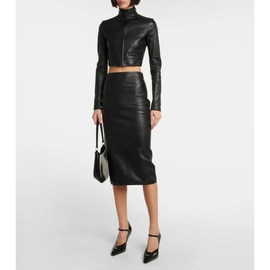 Nothing embraces edgy elegance quite like Prada’s lambskin leather skirt. Made in Italy and fully lined, this midi-length design further elongates its simple, clean lines with the high-rise cut of the silhouette.