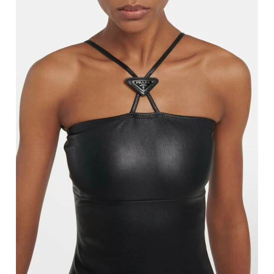 Prada brings us the perfect LBD for after-dark soirées. An edgy and alluring design, it’s made entirely from butter-soft leather and defined by its delicate crossover straps accented with a signature triangular logo plate.