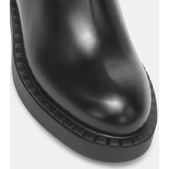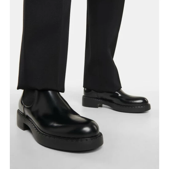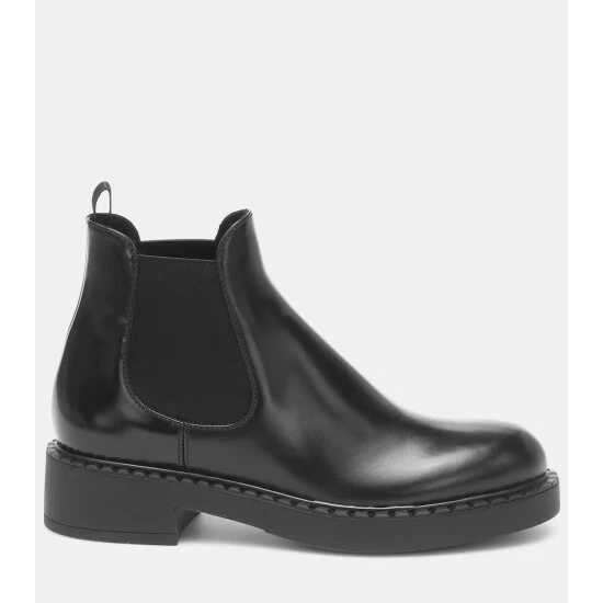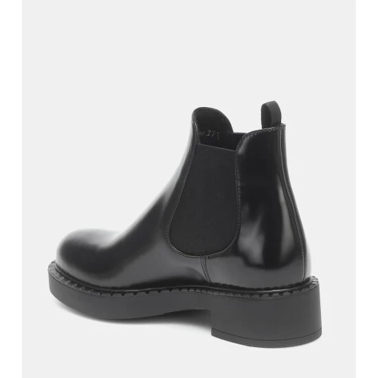 Prada’s timeless design codes shine through with these black platform ankle boots. Made in Italy from polished leather, they have a traditional Chelsea silhouette with elasticated side inserts and are set on practical rubber soles. Style yours with everything from tailoring to off-duty denim.