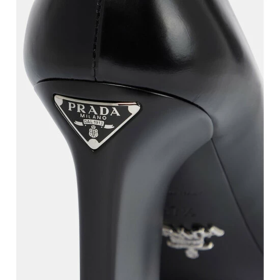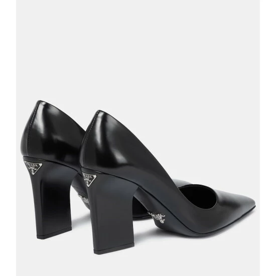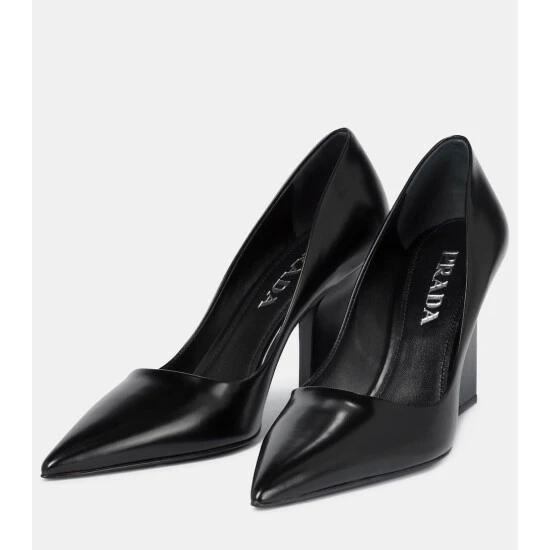 These sophisticated pumps from Prada are crafted from smooth black leather. The timeless design features pointed toes and square heels.