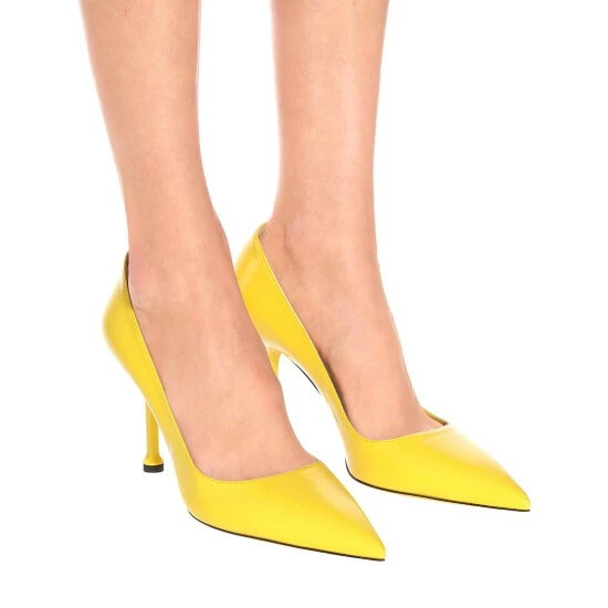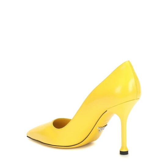 Prada breathes new life into the classic pump with this sunny yellow colorway. Crafted in Italy from smooth calf leather, this pair has sharp pointed toes and is set on the label’s signature architectural heel. Show yours off with cropped suit pants or minidresses.