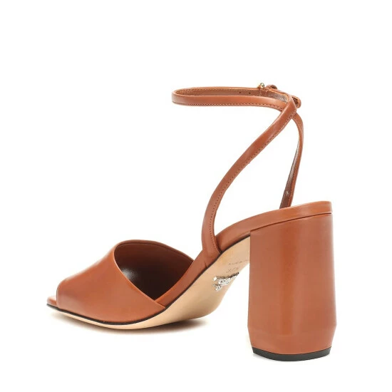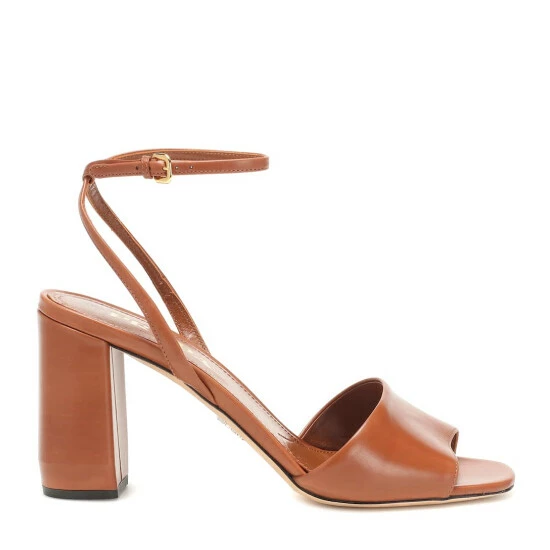 These block-heeled sandals from Prada are crafted in Italy from supple, “Brandy” brown leather. They offer a round, peak-a-boo toe and an ankle strap with a golden-toned buckle closure.