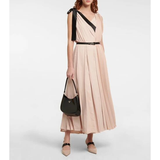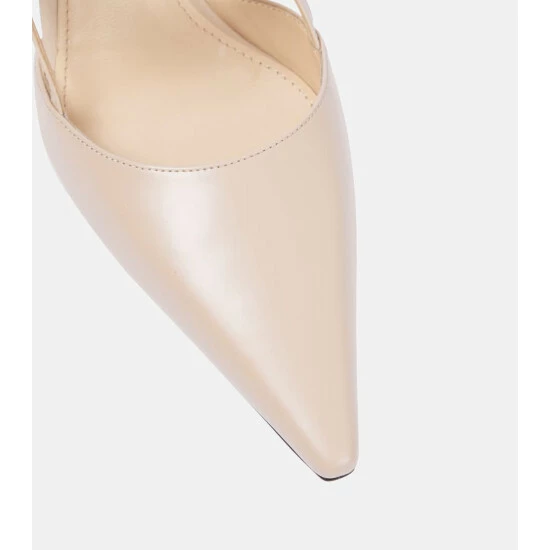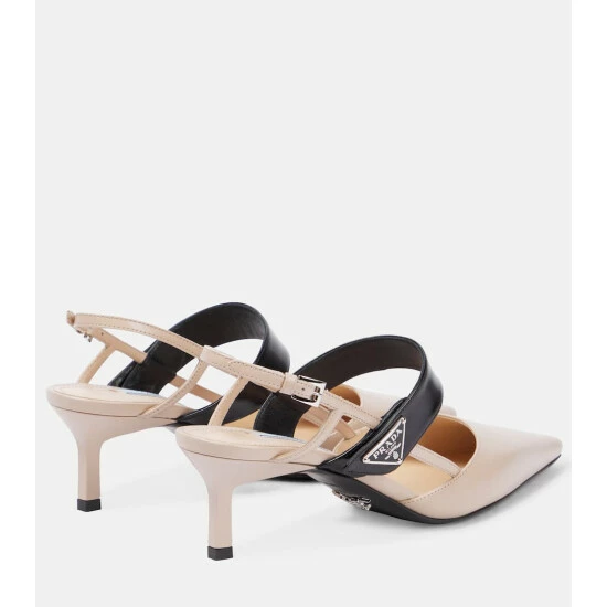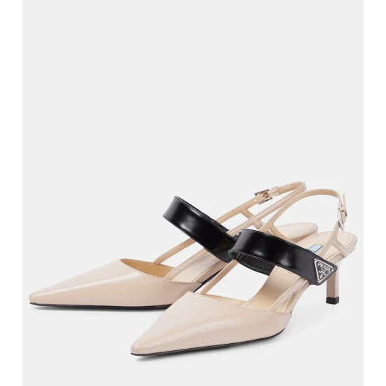 Prada’s leather slingback pumps balance a soft powder pink colorway with a sharp silhouette. They’re designed with the label’s signature kitten heels, and the slender straps across the vamps serve the dual purpose of being both supportive and directional.