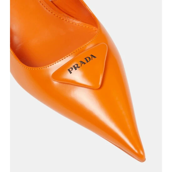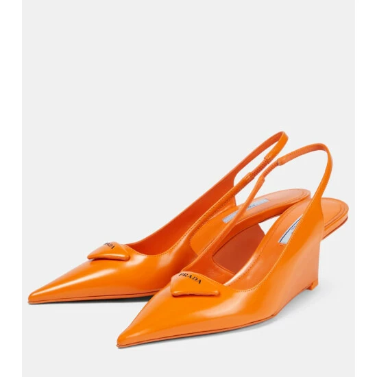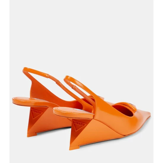 These slingback pumps prove contemporary shoe design is Prada’s forte. They’re made from brushed leather with gravity-defying varnished wedge soles and padded logo plaques.