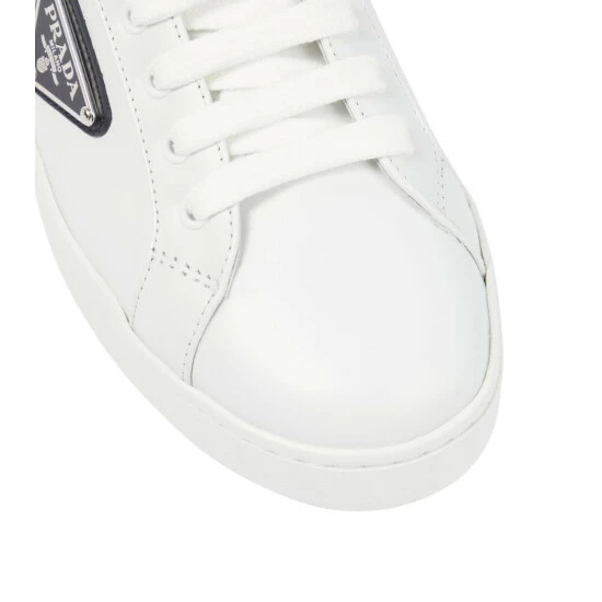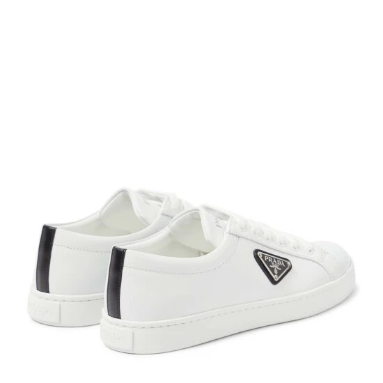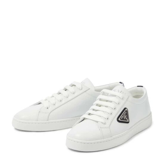 Grow your sneaker edit with this timeless white pair from Prada. They’re made from leather uppers with contrasting strips along the heel counters and instantly recognizable triangular logo plaques.