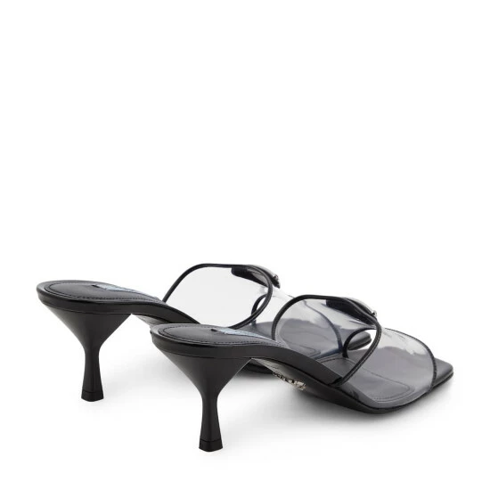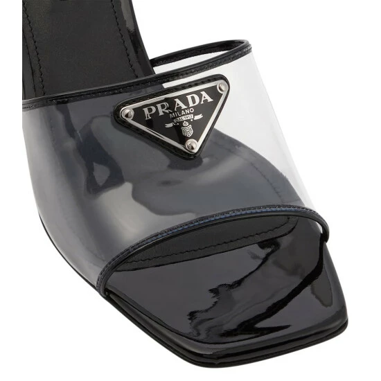 Prada gives a contemporary twist to 90’s style with these PVC mules trimmed with patent leather. This design was made in Italy and has the iconic Triangolo logo embellishment.