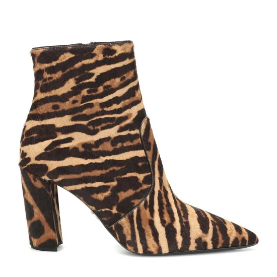 Take a walk on the wild side with these leopard-print ankle boots from Prada. Crafted in Italy from tactile calf hair, the pair works a pointed-toe silhouette set on a mid-block heel. Let yours liven all-black ensembles.