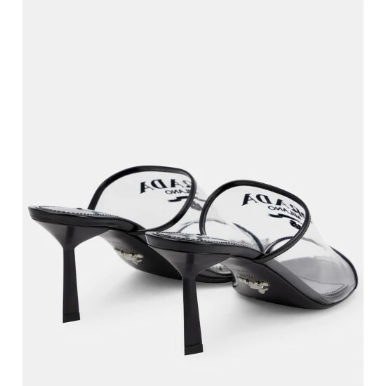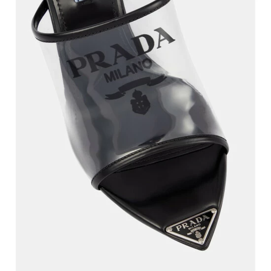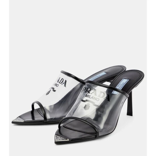 No doubt these Prada mules have our stamp of approval with their logo-printed Plexiglas® straps. They feature leather trims and soles, and 75mm stiletto heels – note the label-signature triangular plaques at the pointed toes.