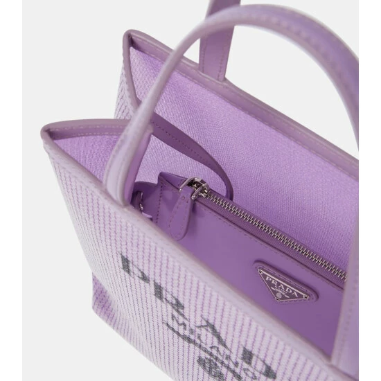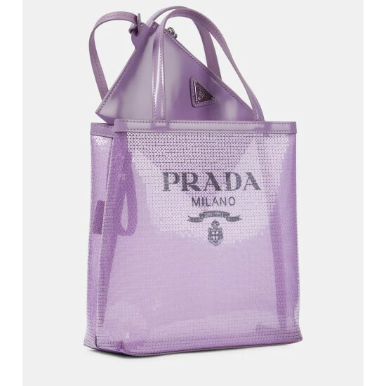 Store your essentials in true Prada style with this small tote. The boxy design is covered with semi-transparent purple sequins and comes with a handy pouch.