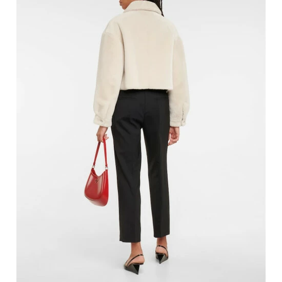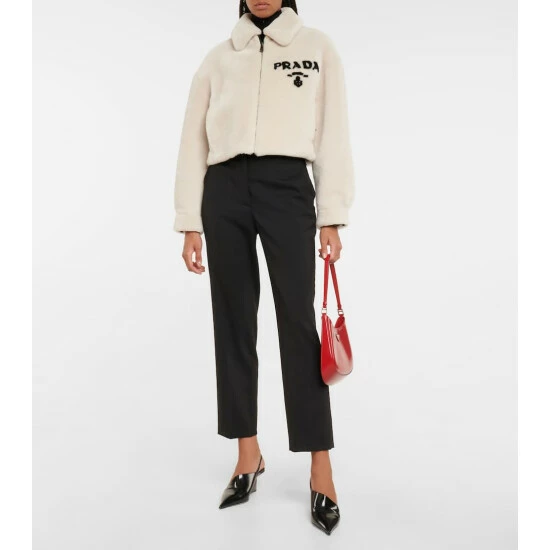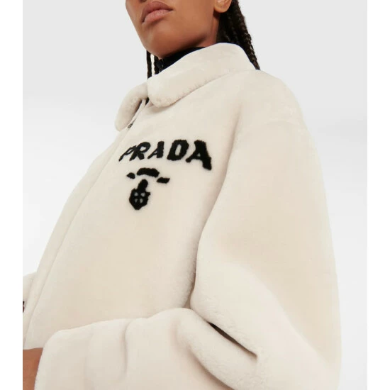 Prada updates this ’60s-tinged short jacket in plush shearling. Emblazoned with a contrasting logo, it has a zipped front, dropped shoulders, and a pointed collar.