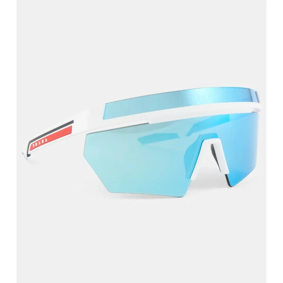 These sunglasses from Prada are made in Italy in a mask-like silhouette with contrasting mirrored lenses. They feature logo engraving at the temples.