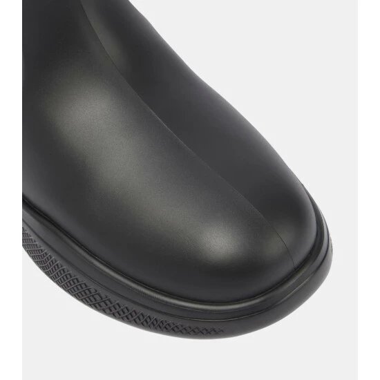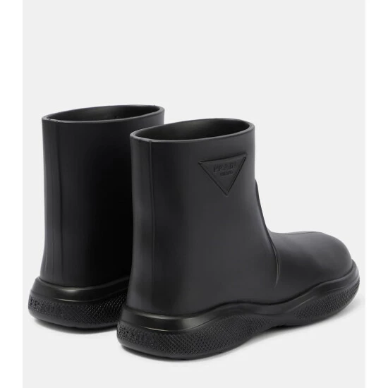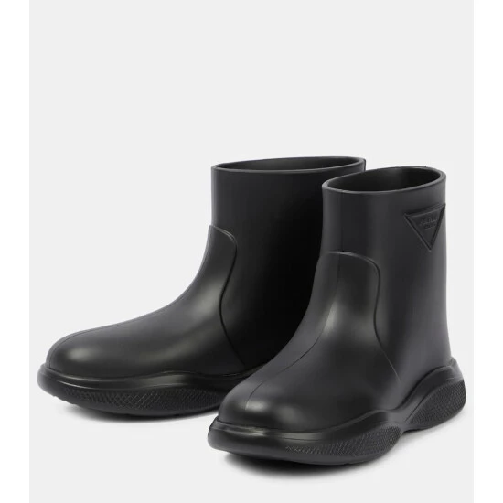 Prada can always be counted on for timeless staples. The Mellow ankle boots are entirely made of black rubber, stamped with triangular logos on the sides, and set on textured soles.