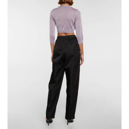 For an eye-catching addition to your knitwear edit, consider this shimmering cardigan from Prada. A cropped style, it’s threaded with metallic fibers and has the label’s logo intarsia-knit on the chest.