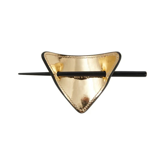 This barrette from Prada is made in Italy from metallic leather in a geometric shape that resembles the triangle house logo it prominently features. This style has a Plexiglas® stick for fastening.