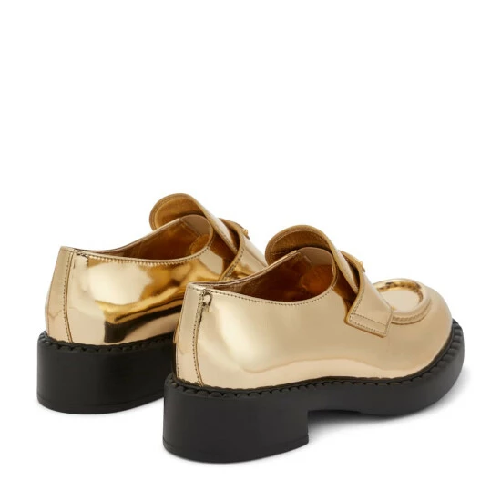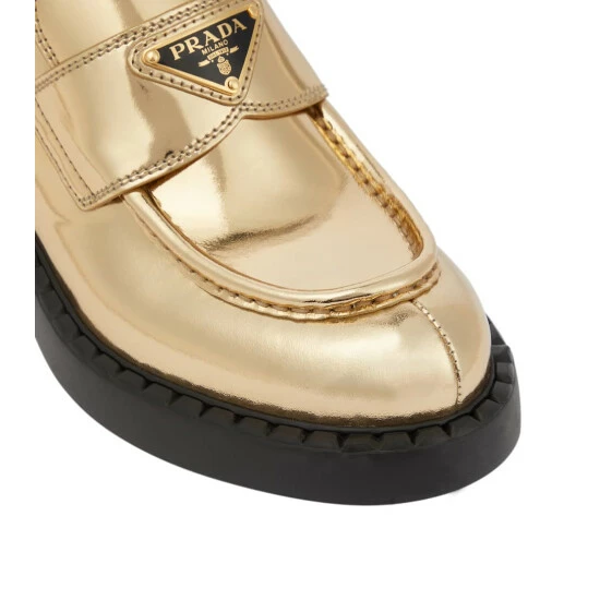 The perfect embodiment of forward-thinking fashion, these metallic leather Prada loafers have our stamp of approval. They sit on chunky rubber soles and feature the brand’s iconic triangular logo plaques.