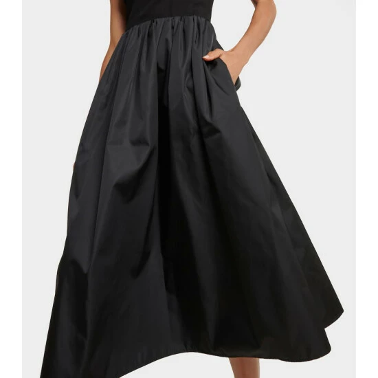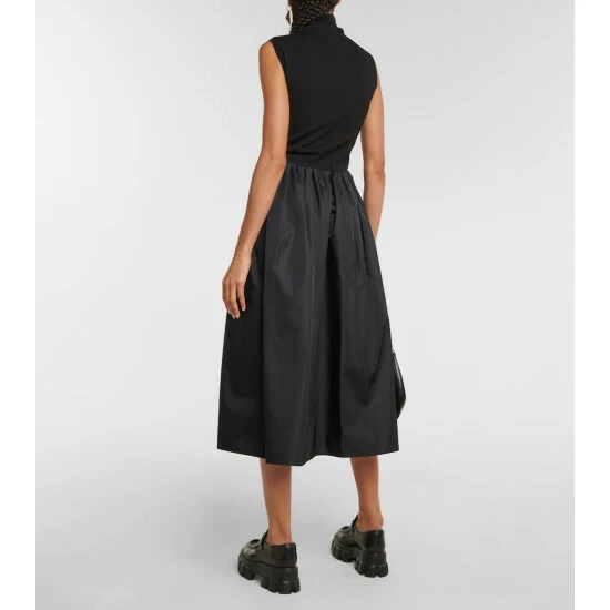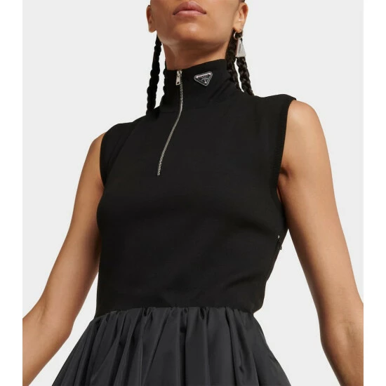 This midi dress from Prada has a compact knit bodice and a flared gabardine skirt. Accented with an enameled logo plaque, it features a partial zipped front and a mockneck collar.